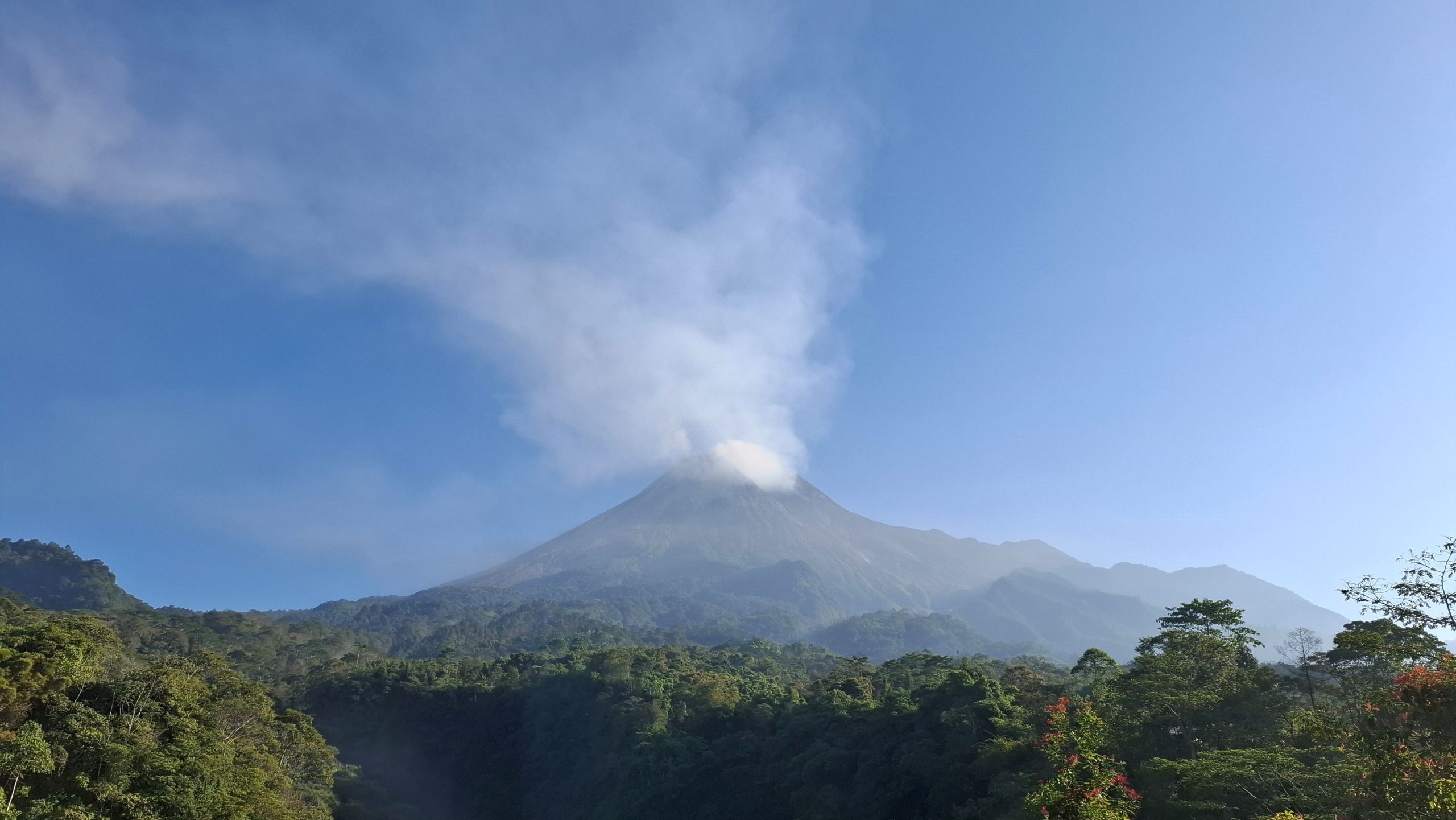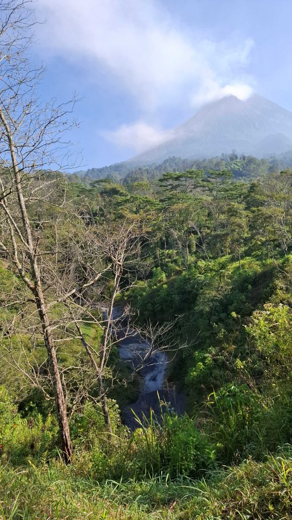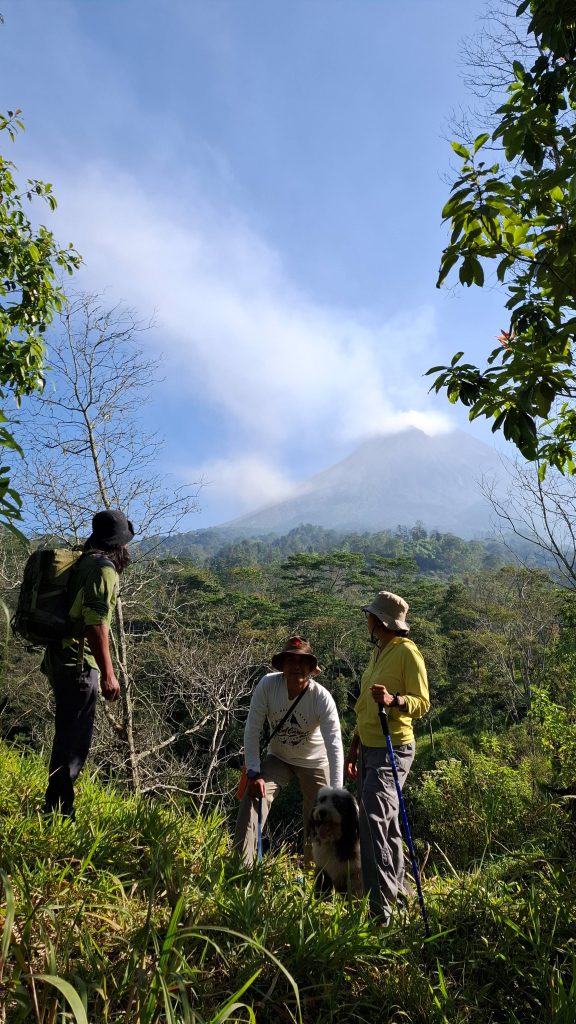 Sudah lama ingin sekali trekking di sekitar kaki Gunung Merapi. Sudah menjadi “bucket list” ” kami selama ini. Kabarnya pemandangannya sangat cantik dengan lembah yang terjadi karena aliran lahar yang sudah mengering, serta sungai dan mata air yang jernih. Akhirnya kesempatan itu pun terwujud pada pertengahan bulan Agustus 2024. Pagi itu, kami berangkat pukul 6.30 pagi dari Omah Kepel, berbekal kudapan manis dan beberapa botol air minum, menuju Kali Kuning Park yang berlokasi di Umbul Harjo, Cangkringan. Kebetulan Omah Kepel Adventure bekerjasama dengan beberapa tim SAR Gunung Merapi yang akan menjadi pemandu kami. Tak lama setelah bertemu di lokasi, kami pun memulai perjalanan. Pada awalnya kami masih melewati jalan beraspal yang lama kelamaan terganti dengan tanah berpasir yang telat memadat.
