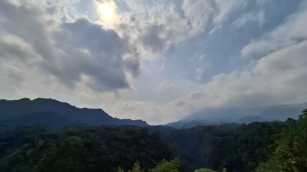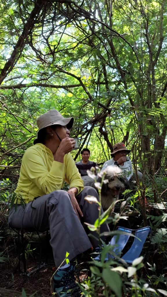 Kami lanjutkan perjalanan melewati hutan yang cukup rimbun. Di sana kami sempatkan diri untuk duduk sejenak di bawah rindangnya pepohonan. Seduhan teh dan kopi panas, serta kudapan legit, terasa nikmat di pagi menjelang siang itu.