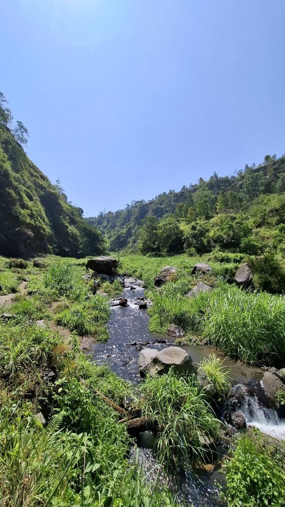 Dari sini, kami kembali menyusuri jalur menuruni bukit menuju daerah Plunyon untuk melihat dam yang pertama kali dibangun di kaki Gunung Merapi serta sungai di sekitarnya. Asiknya, ketika menyusuri lembah Plunyon-Kali Kuning sepanjang sekitar 1 kilometer, kami seperti sedang berjalan di jurassic valley. Dan ketika melihat aliran sungai dengan air yang sangat jernih dengan tumbuhan subur di sekitarnya, ingin sekali rasanya menceburkan diri. Apalagi sinar matahari mulai terasa terik. Aliran air bening dan segar ini seperti “memanggil-manggil” mengajak kami bermain di sana.