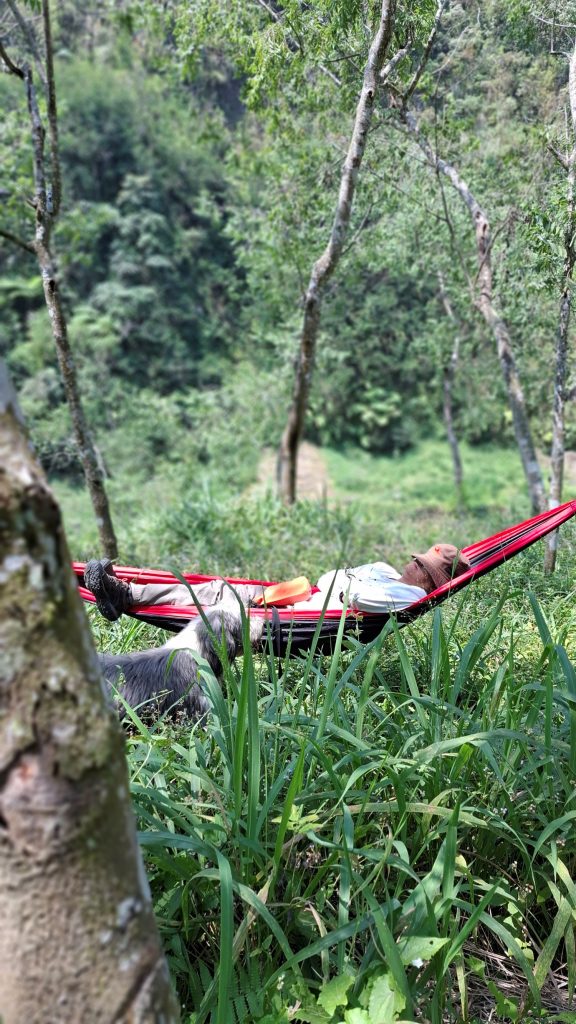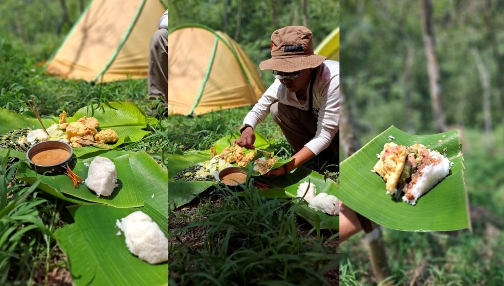 Puas sekadar mencuci muka dengan air sungai yang jernih, kami lanjutnya perjalanan menuju bukit yang akan menjadi tempat kami beristirahat untuk makan siang. Rute kali ini kembali menanjak namun landai dan menyenangkan, karena mata kami terus dimanjakan dengan panorama kaki Gunung Merapi yang hijau. Akhirnya kami tiba di area tempat kami beristirahat. Sambil menunggu pemandu kami beserta timnya menyiapkan makan siang berupa nasi pecel dan tahu susur, kami sempatkan diri untuk memejamkan mata di hammock yang sudah disediakan atau sekadar duduk diam melihat pemandangan yang tidak setiap hari bisa kami nikmati. Semilir angin membelai kulit kami yang hangat karena sinar matahari yang cerah. Gemerisik dedaunan menjadi irama alam yang menenangkan. Di tengah keheningan suara alam, sesekali terdengar suara Elang Jawa dari kejauhan. Rasanya sangat tenang dan damai.