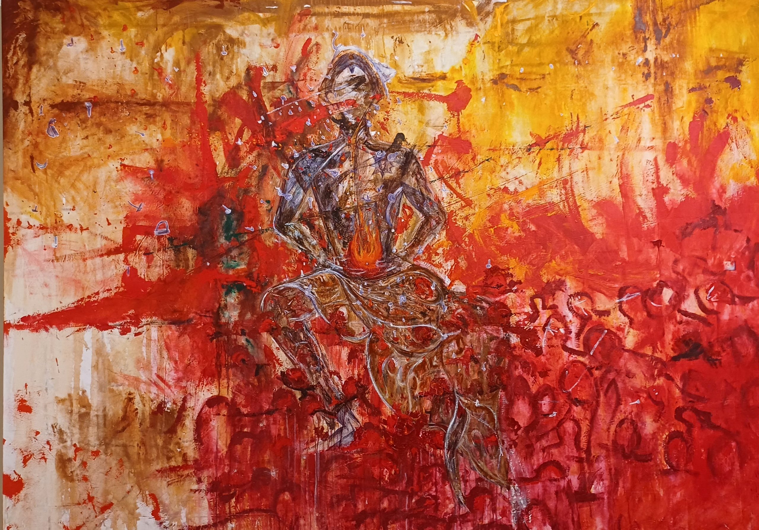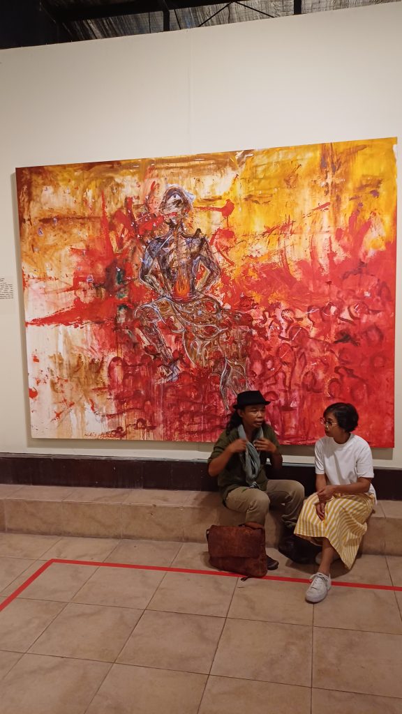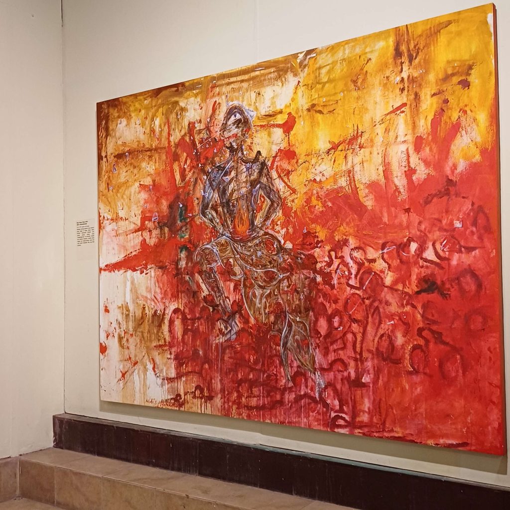Terpampang di salah satu dinding Pendhapa Art Space, karya Widi S. Martohihardjo, bisa dikatakan lantang bersuara. Mengisi hampir sebagian dinding dalam semburat merah menjadi rona yang mendominasi dan mengundang siapa saja untuk melihat karya ini dengan lebih dekat. Mengusung judul “Raja Tanpa Tahta”, mata pun menelusuri lukisan abstrak ini sambil mempertanyakan, ‘siapakah gerangan sosok dalam lukisan ini?’.