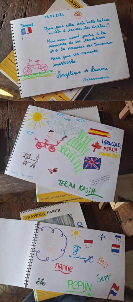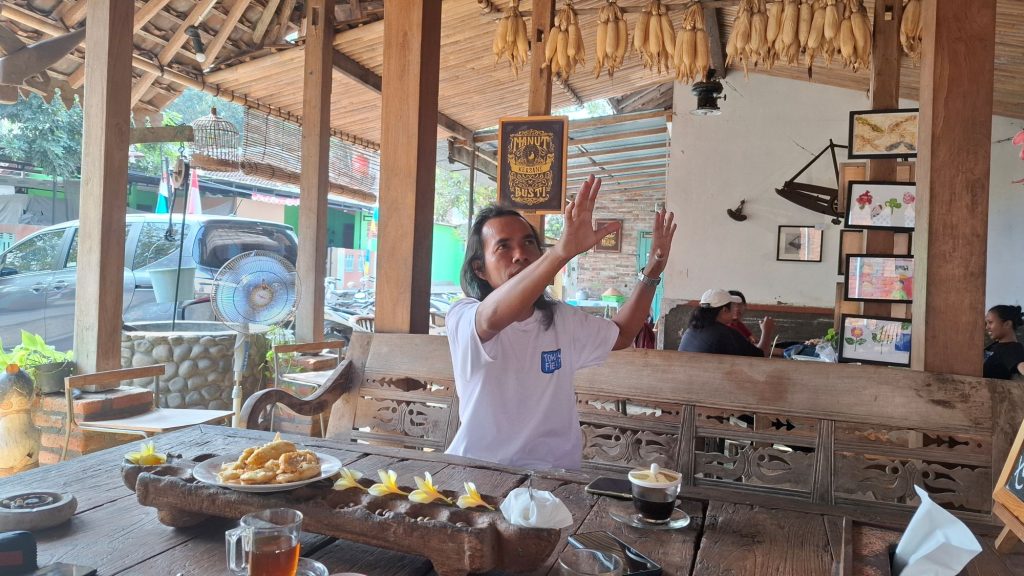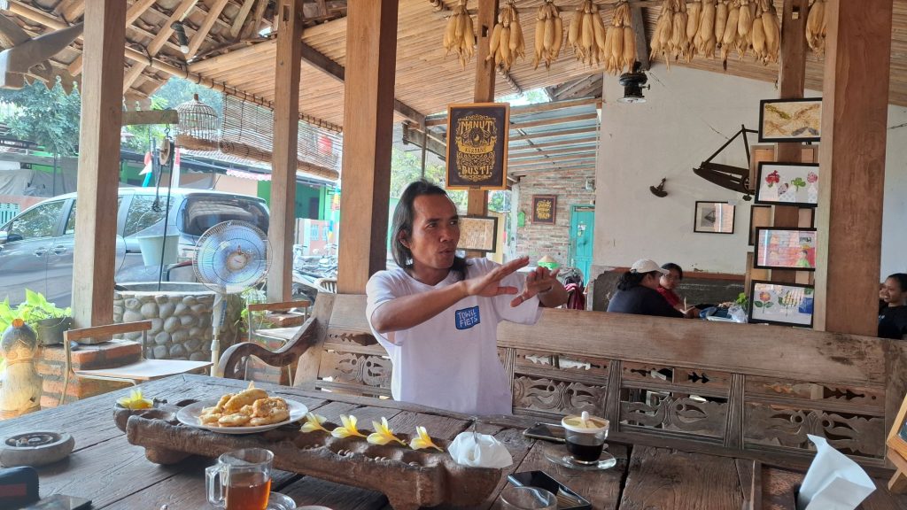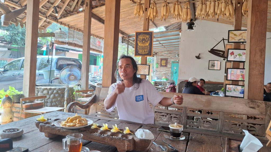 “Selama 1 tahun saya menjemput tamu untuk dibawa ke Sentolo dan kemudian berkeliling dari desa ke desa dengan sepeda onthel. Semua saya kerjakan sendiri. Selanjutnya saya libatkan masyarakat setempat karena tamu sudah semakin banyak. Kebetulan istri saya pintar masak, jadi kami kemas program Wisata Desa menjadi satu paket termasuk makan siang dengan menu masakan rumah khas Yogya. Walau masih memandu tamu bersepeda onthel keliling desa, sekarang saya dibantu anak-anak muda yang tidak hanyabisa bersepeda tapi juga cas cis cus berbahasa Inggris.”